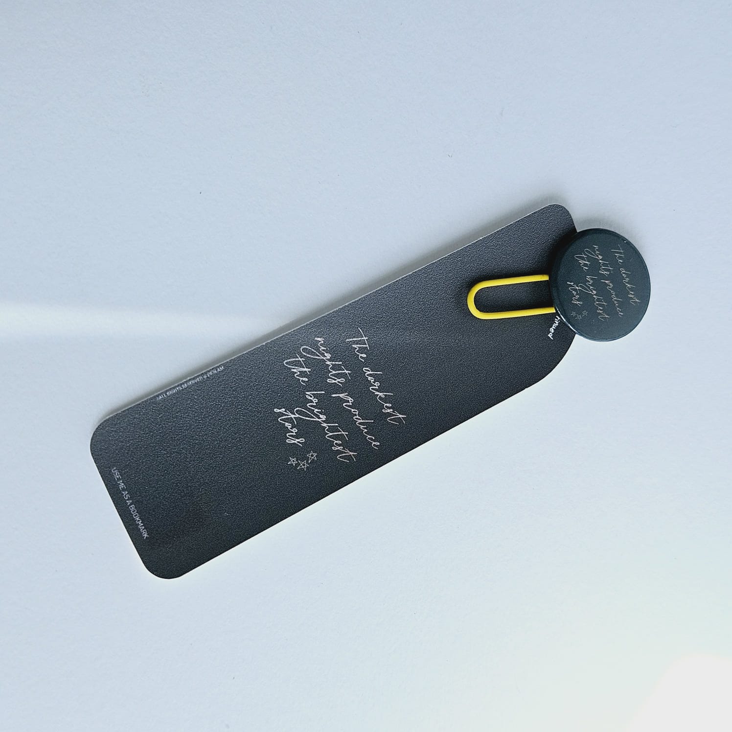 Pin bookmark of 25mm has matching colour background with The Darkest Nights Produce the Brightest Stars on it.